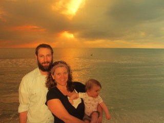 The temperature was in the 50’s…a far cry from the -3 degrees we left a week ago, but not terribly far from the high 70’s we experienced in southern Florida. After wrapping up some work this afternoon, I loaded Critter up in her fancy Chariot and hooked her up to my trusty ride. Rode my bike through the hood in the sunshine with Critter giggling all the while behind me. Got two Jeopardy! matches in, and rode back to our cabin.  Had birthday dinner celebration with our dear friends, read a book with Daddio to Critter, and tucked her in to bed.