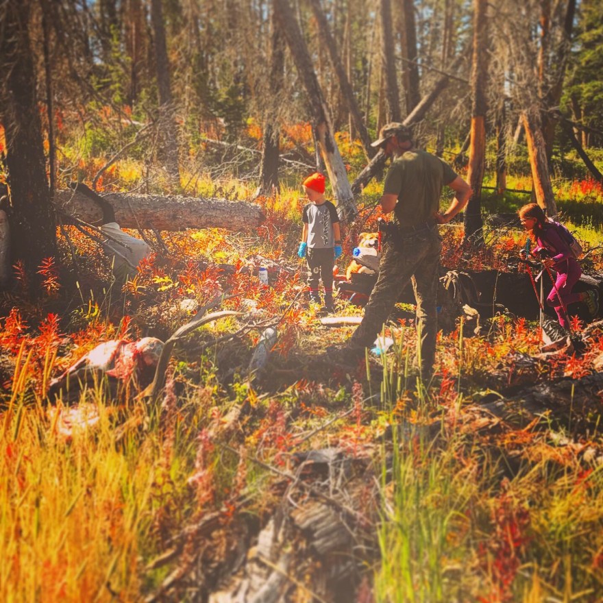 we spend two hours pacing around until we got the call again. DW had the elk quartered and was heading down to the side-by-side with a back leg. we hopped in the truck, and met him there. after some rigamarole (Crit calls is arithmetic), we were ready for adventure. it began with a creek crossing over a log. trekking poles were handed back and forth and everyone was patting themselves on the back for the first success. then we began to climb. up and up. it was just short of a mile to the elk, and our great fortune had us following a game trail for much of the ascent. as challenging as the hike was, there was no whining, complaining, nor negative vibes at all. Tink squealed with delight when he found himself inside a patch of wild raspberries. jackpot.